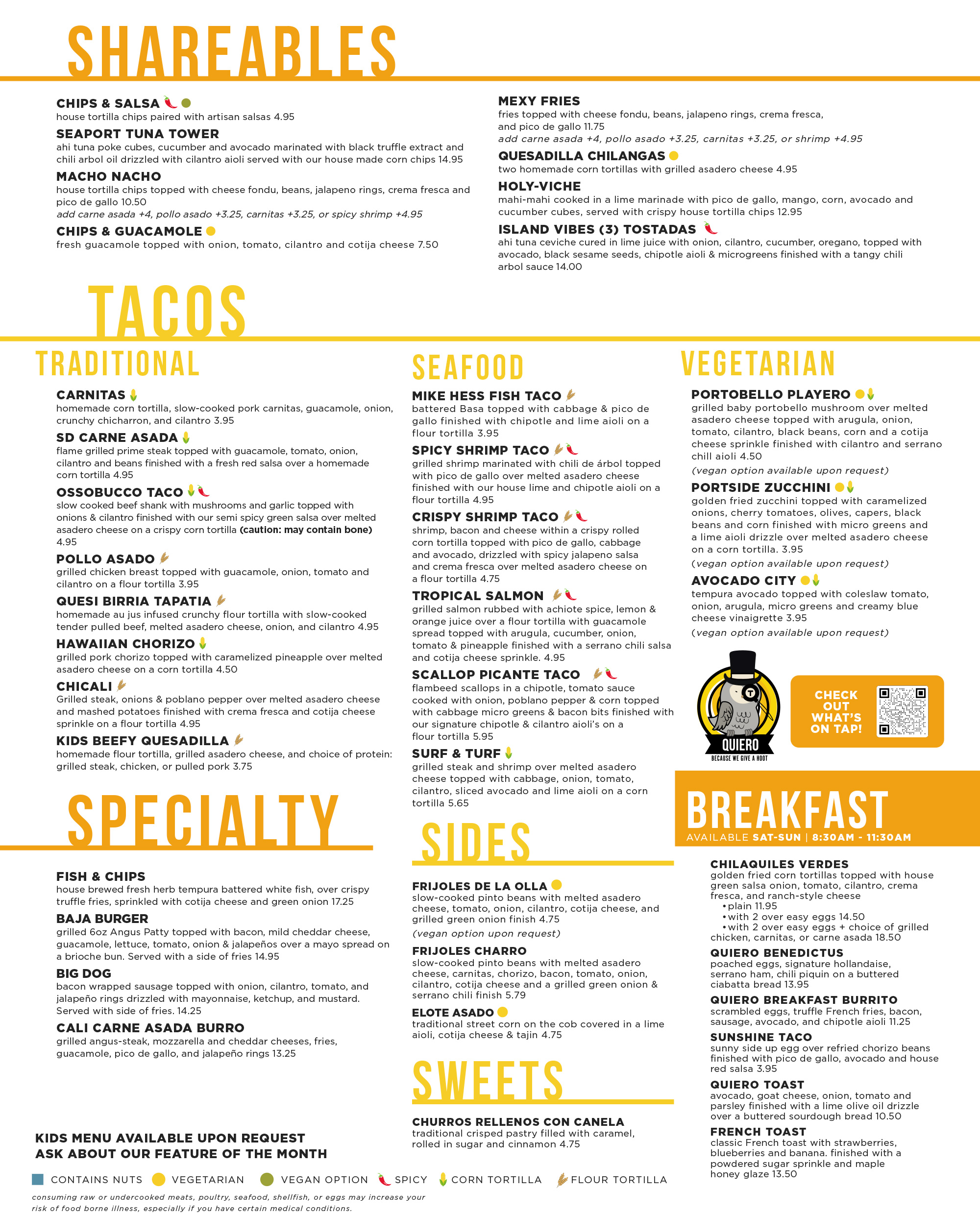 Visit us for savory selections, ranging from snacks and starters to hearty entrées and fresh seafood. Start your dining experience with an order of the Macho Nacho, savor a Mike Hess Fish Taco featuring battered basa fish, cabbage, onion, tomato, and housemade chipotle aioli, and end on a sweet note with decadent Churros Rellenos con Canela—a traditional crisped pastry filled with sweet caramel and rolled in sugar and cinnamon.